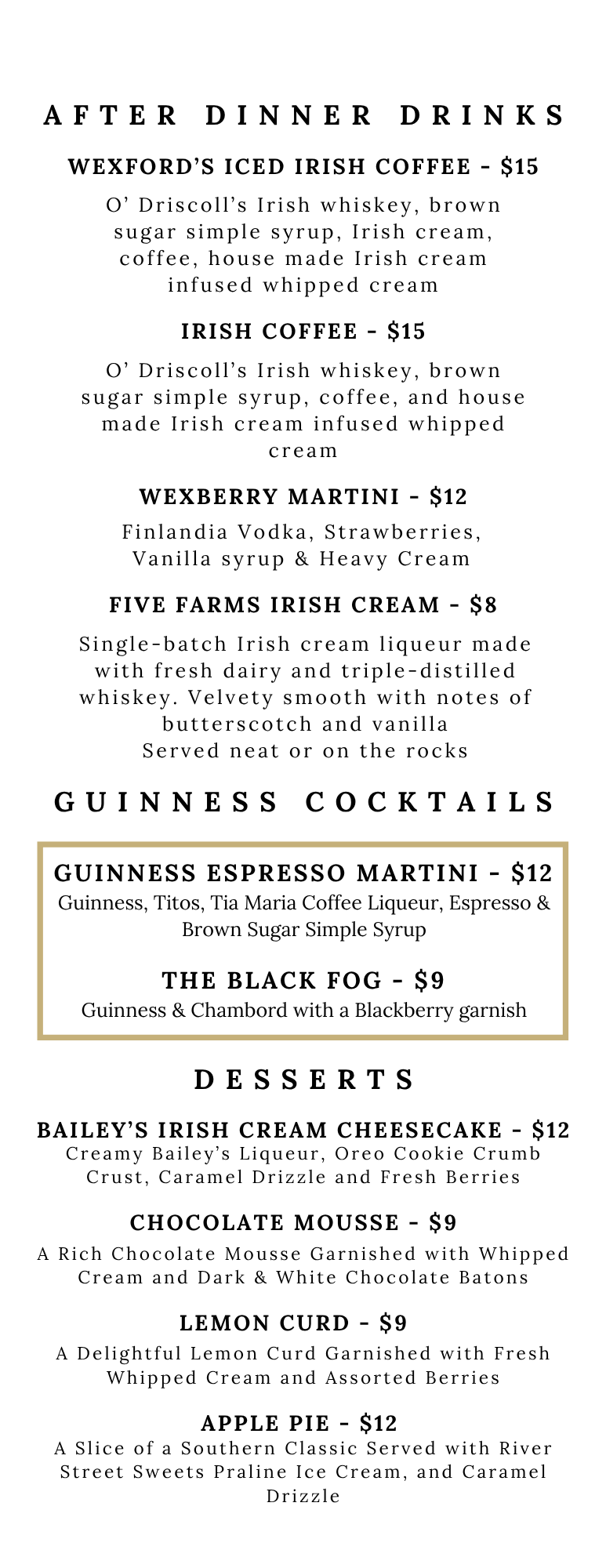 O'Driscoll's Irish Whiskey, brown sugar simple syrup, Irish Cream, coffee, house made Irish Cream infused whipped cream